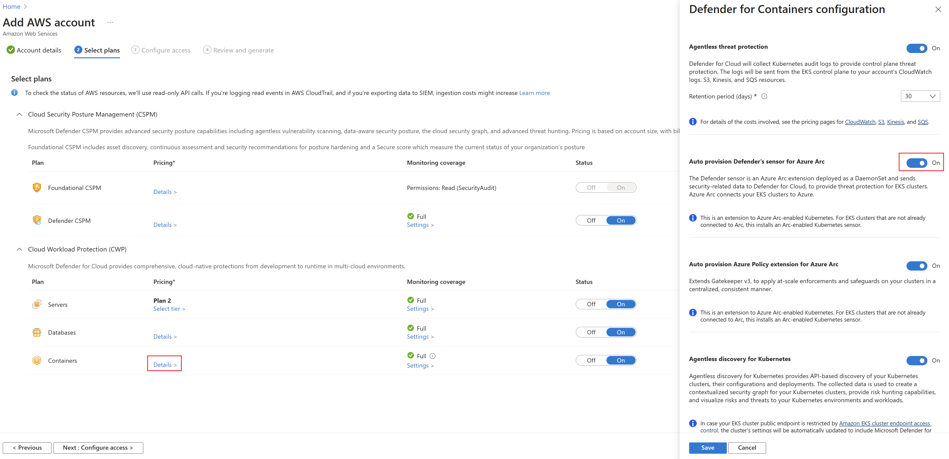 This article shows you how to enable Microsoft Defender for Containers on your Amazon EKS clusters through the Azure portal. You can choose to enable all security features at once for comprehensive protection, or selectively deploy specific components based on your requirements.