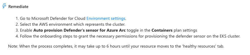 You need to install and run Azure Arc-enabled Kubernetes, the Defender sensor, and Azure Policy for Kubernetes on your EKS clusters. There's a dedicated Defender for Cloud recommendation to install these extensions: