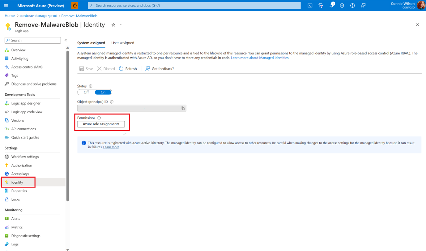 To allow the Logic App to delete blobs from your storage account, add a role assignment: