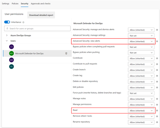 Ensure the user permissions for the Microsoft Defender for DevOps have Advanced Security: view alerts and Read set to Allow. These permissions might have changed if the "Inheritance" toggle was switched off. If the necessary permissions are set to Not set or Deny, they'll need to be manually updated to Allow otherwise the GHAzDO findings won't show up in Defender for Cloud recommendations.