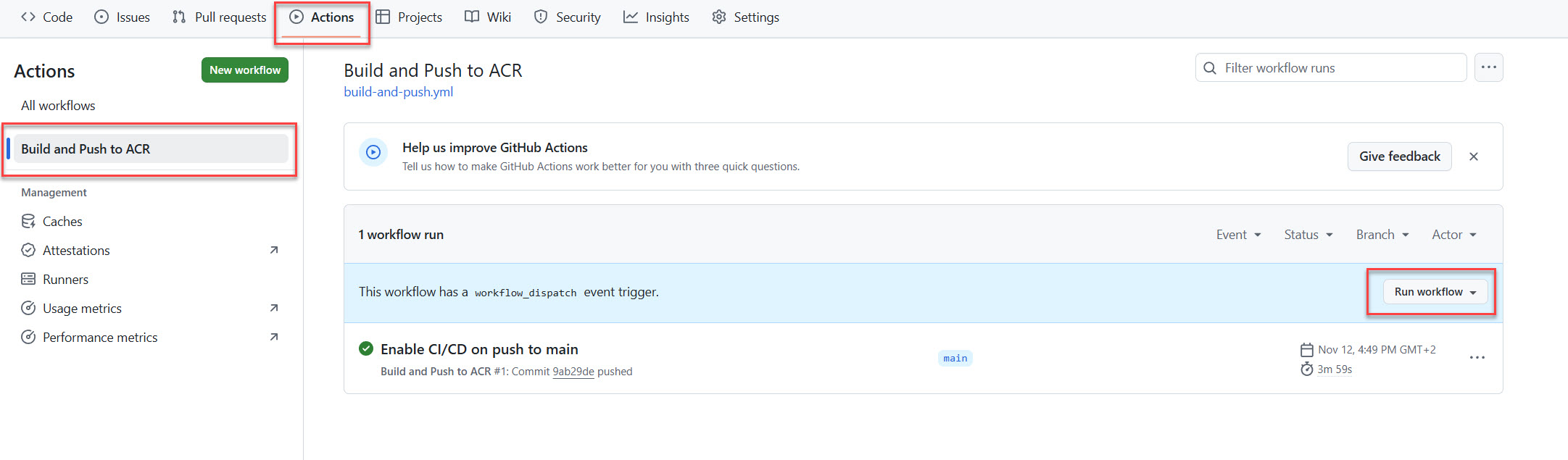 Select the Build and Push to ACR workflow, and then select Run workflow.