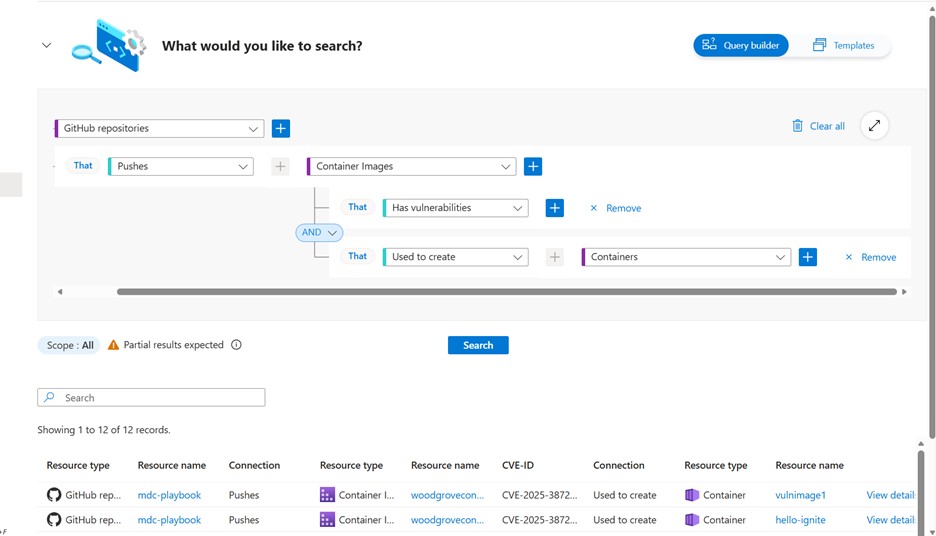 Go to Cloud Security Explorer and perform the query. The validation queries test whether Defender can identify artifacts produced by your pipelines and workloads. If the queries return results, it indicates that scanning and correlation are working as expected.