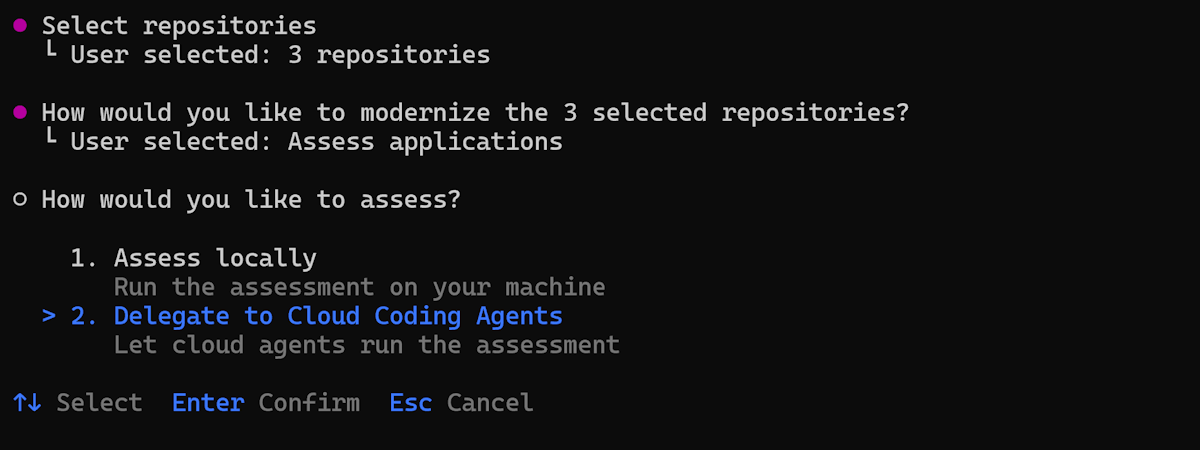 To run assessment, choose to either assess locally or delegate to cloud coding agents. Select 1. Assess locally.