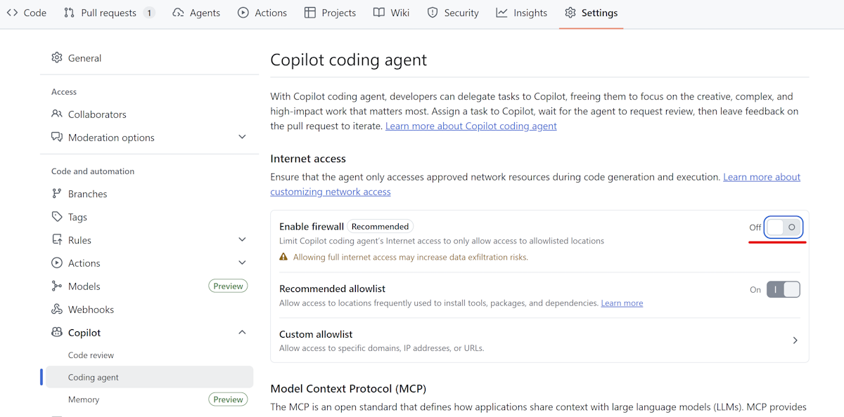 Disable Copilot coding agent's integrated firewall in your repository settings as shown in the following image: