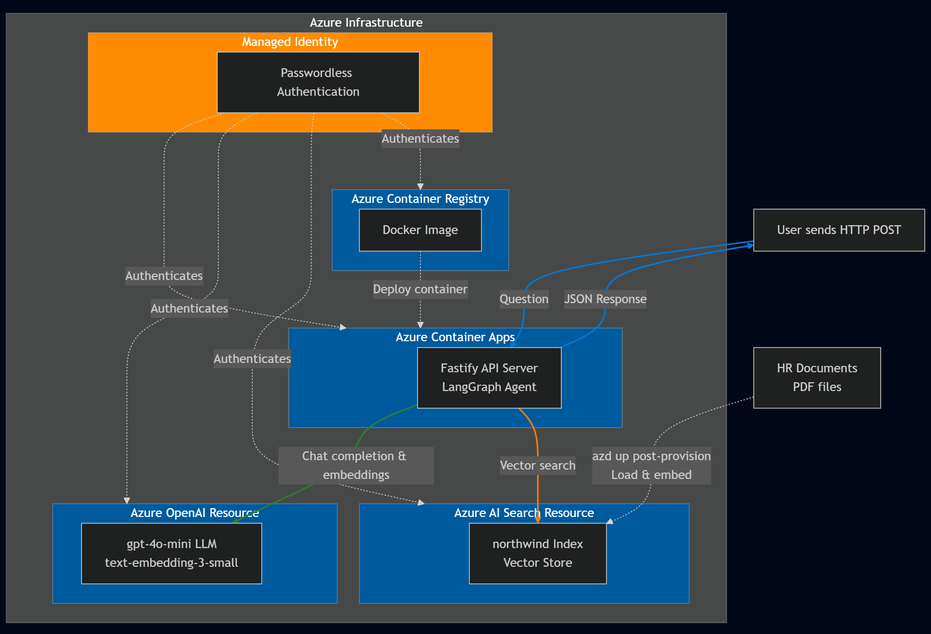 This sample provides the code you need to create secure Azure resources, build the LangChain.js agent with Azure AI Search and Azure OpenAI, and use the agent from a Node.js Fastify API server.