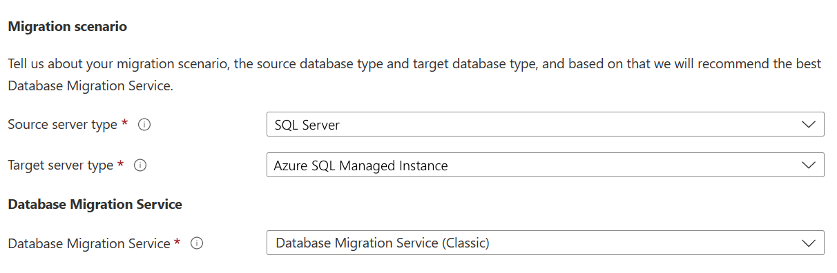 Select the appropriate Source server type and Target server type, and choose the Database Migration Service (Classic) option.