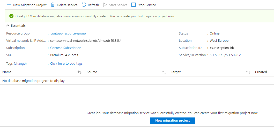 After a few moments, your instance of the Azure Database Migration service is created and ready to use: