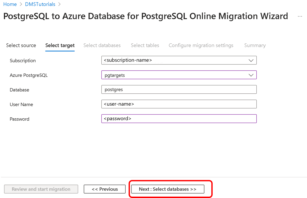 On the Target details screen, specify the connection details for the target Azure Database for PostgreSQL - Flexible server, which is the pre-provisioned instance to which the schema was deployed by using pg_dump.