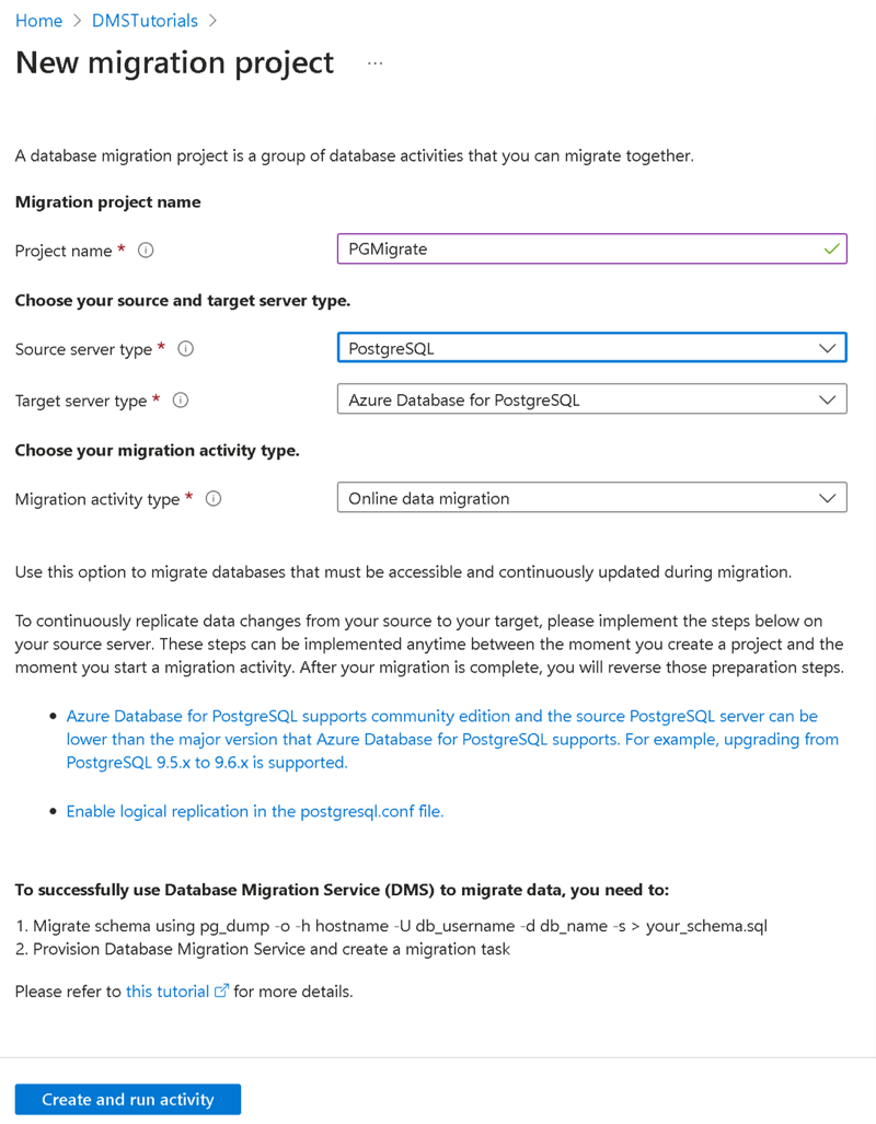 On the New migration project screen, specify a name for the project, in the Source server type text box, select PostgreSQL, in the Target server type text box, select Azure Database for PostgreSQL.