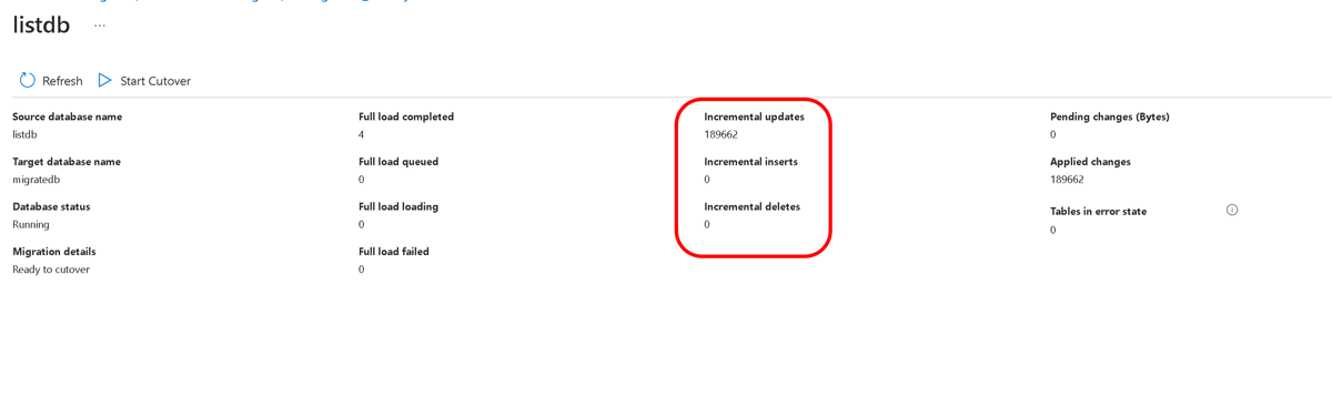 When the migration is complete, under Database Name, select a specific database to get to the migration status for Full data load and Incremental data sync operations.