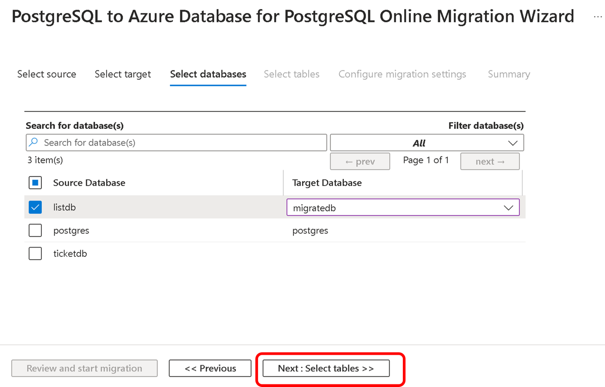 Select Next:Select databases, and then on the Select databases screen, map the source and the target database for migration.