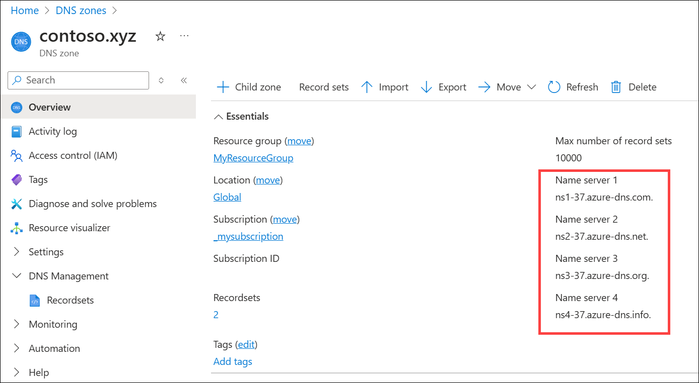 - On the Overview page, retrieve the name servers. In this example, the DNS zone contoso.xyz has been assigned name servers