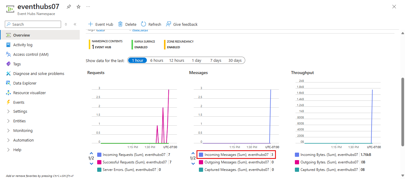 In the Azure portal, the Overview page for your Event Hubs namespace shows that Event Grid sent those three events to the event hub. You see the same chart on the Overview page for the demohub Event Hubs instance.