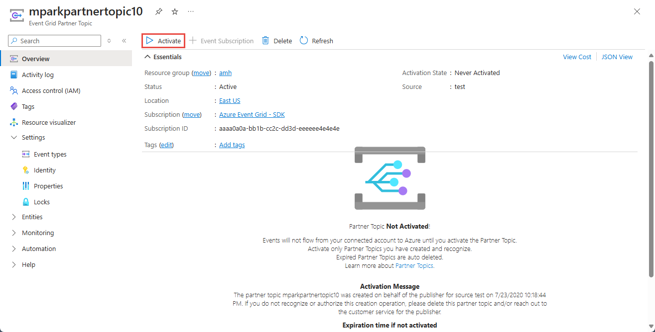 Confirm that the activation status is set to Activated and then create event subscriptions for the partner topic by selecting + Event Subscription on the command bar.
