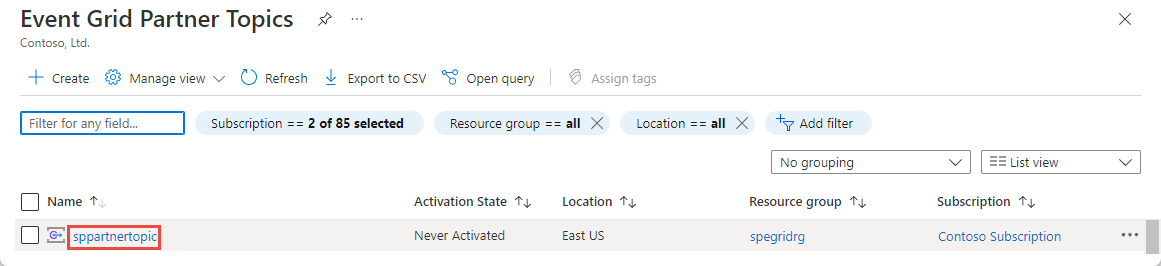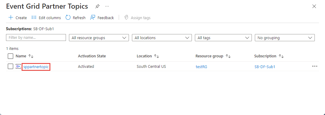 On the Event Grid Partner Topics page, select the partner topic in the list.