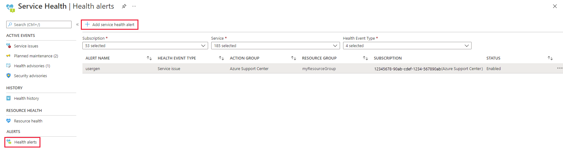 To create a new alert, select Add service health alert at the top of the page.