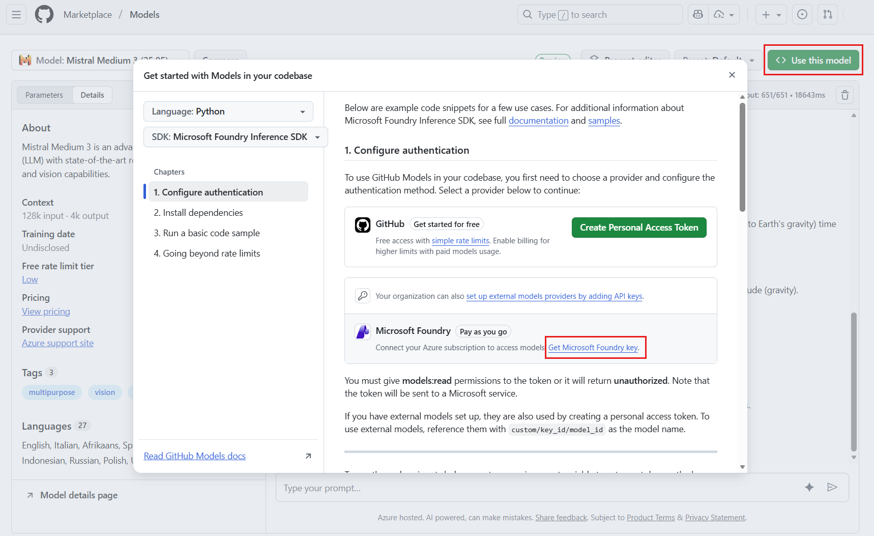Return to the model's playground and select Get Microsoft Foundry key again.