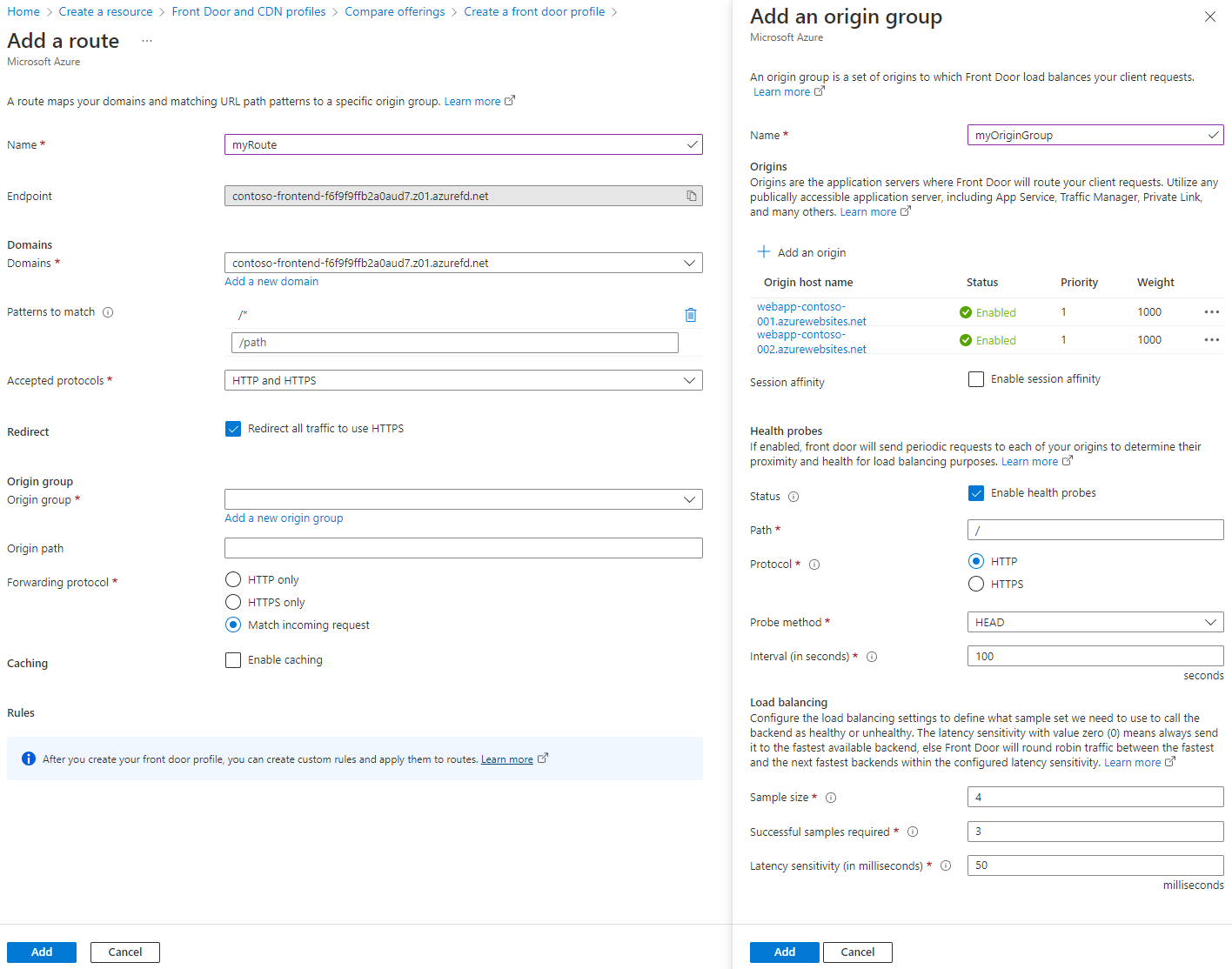In this quickstart, you use the Custom create option to create an Azure Front Door profile. You first deploy two App services as your origin servers. Then, you configure the Azure Front Door profile to route traffic to your App services based on certain rules. Finally, you test the connectivity to your App services by accessing the Azure Front Door frontend hostname.