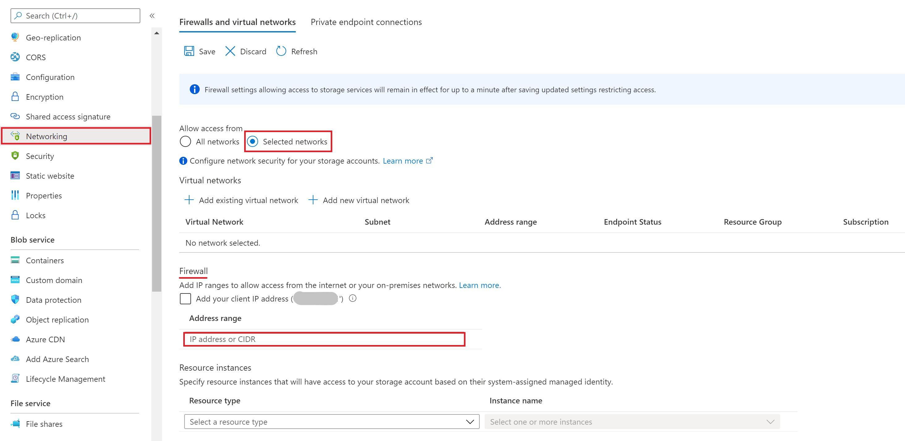 Select a storage account from the Azure portal, and then select the Networking blade. Select Selected networks under the Firewalls and virtual networks tab.