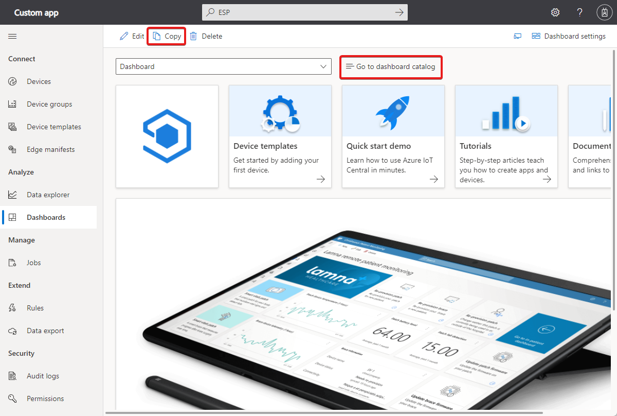 The following screenshot shows the dashboard in an application created from the Custom Application template. If you're in a role with the appropriate permissions, you can customize the default dashboard. To create a new dashboard from scratch, select Go to dashboard catalog and then +New. To create a new dashboard by copying the current dashboard, select Copy: