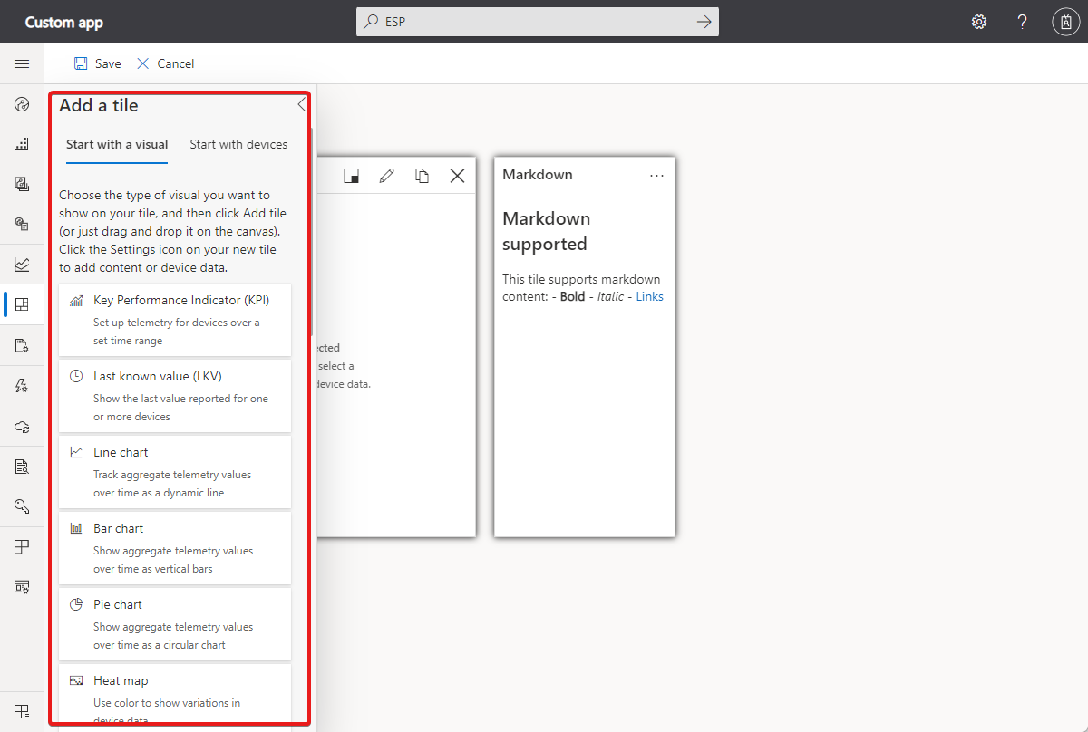 After you select Edit, the dashboard is in edit mode. You can use the tools in the Add a tile panel to add tiles to the dashboard. You can customize and remove tiles on the dashboard itself. For example, to add a line chart tile to track telemetry values reported by one or more devices over time: