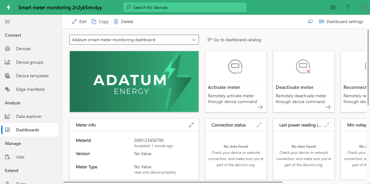 Adatum is a fictitious energy company that monitors and manages smart meters. The dashboard for monitoring smart meters shows properties, data, and sample commands for meters. The dashboard enables operators and support teams to proactively perform the following activities before they become support incidents: