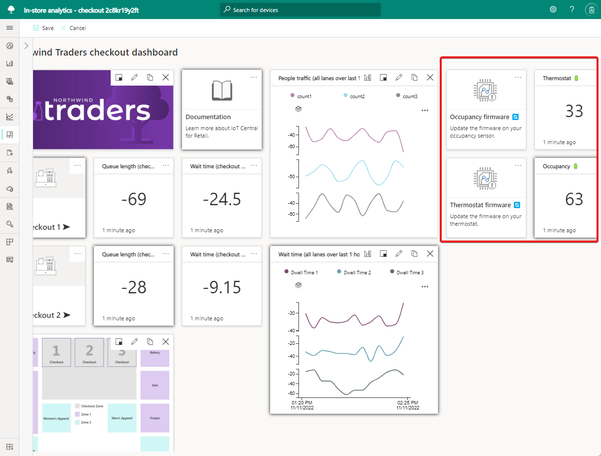 A key step in customizing a dashboard is to rearrange the tiles to create a useful view. Application operators use the dashboard to visualize device telemetry, manage devices, and monitor conditions in a store.