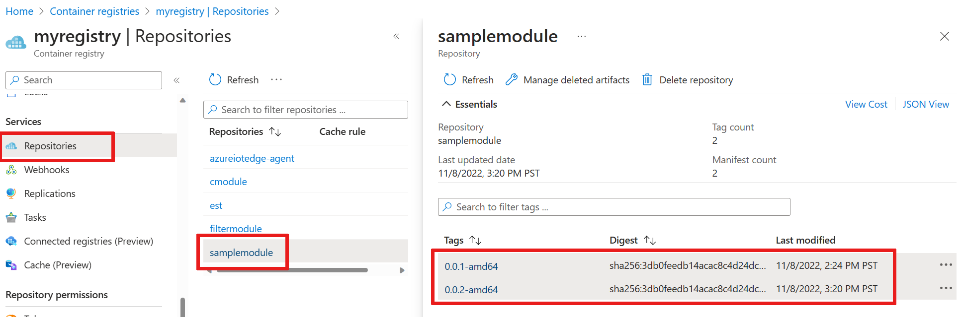 To further verify what the build and push command did, go to the Azure portal and navigate to your container registry. In your container registry, select Repositories then filtermodule. Verify that both versions of the image push to the registry.