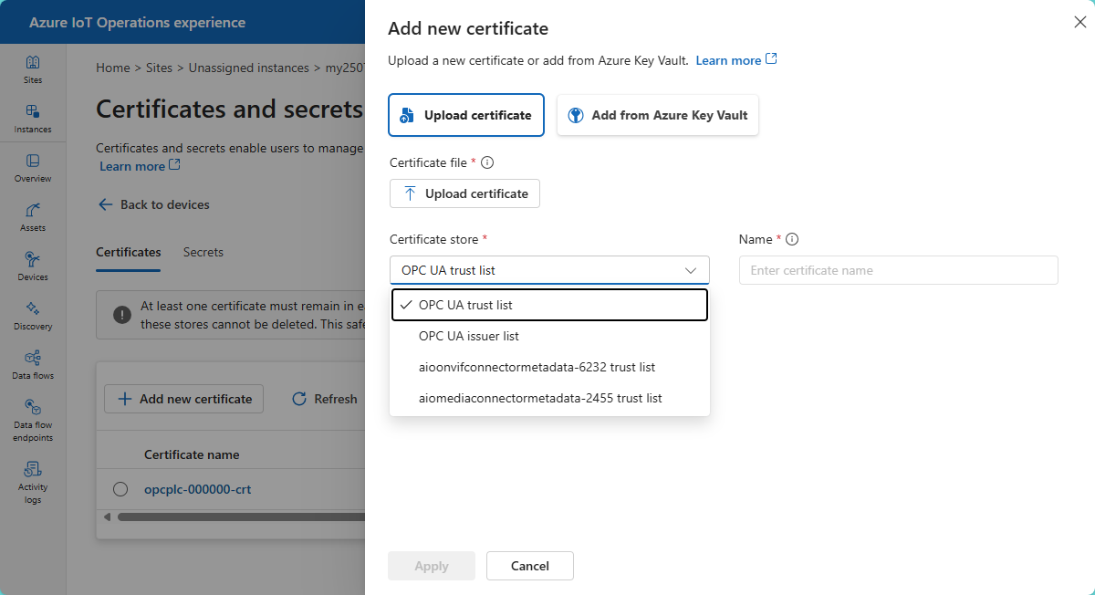 - Select the appropriate certificate store for the connector that uses the certificate. For example, OPC UA trust list.