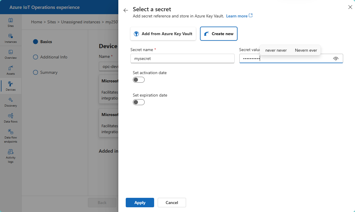 After the set up secrets management steps are complete, you can add secrets to Azure Key Vault, and sync them to the Kubernetes cluster to be used in Device inbound endpoints or Data flow endpoints using the operations experience web UI. Secrets are typically usernames, passwords, certificates, or private keys required for authentication to external systems.