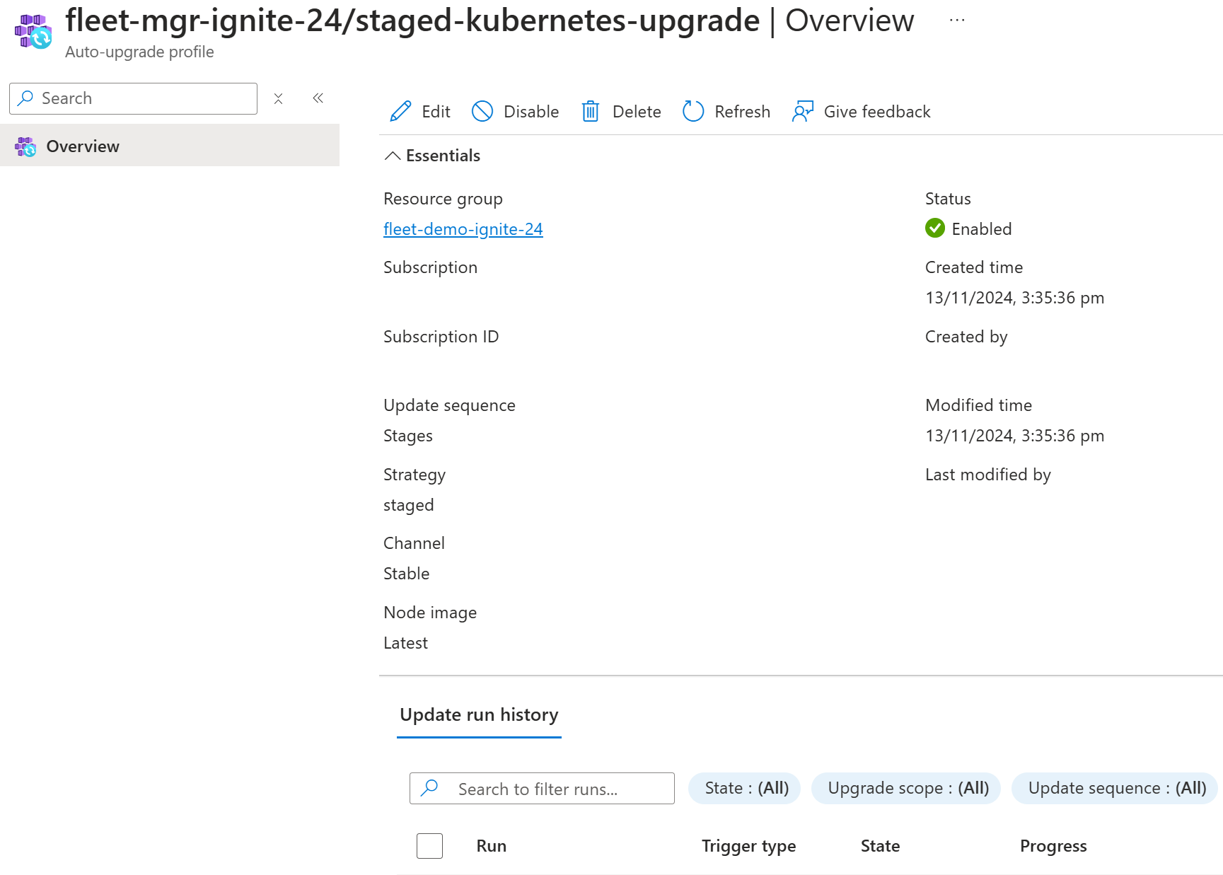 For more information on creating an on-demand update run from an auto-upgrade profile, see generate an update run from an auto-upgrade profile.
