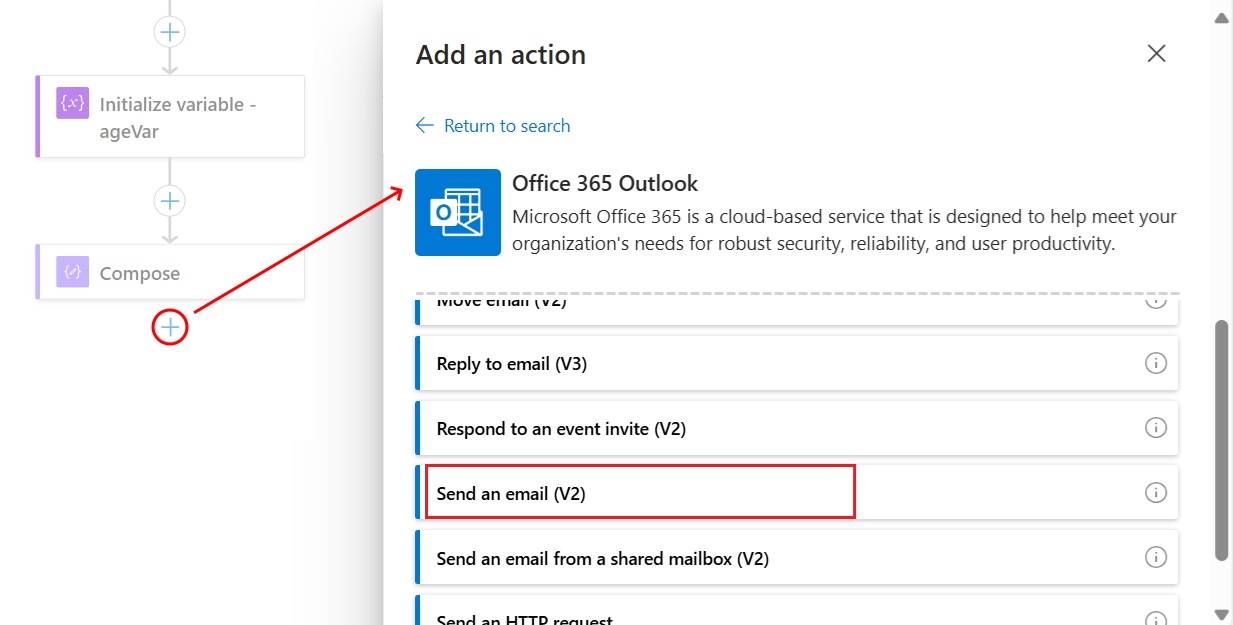 This example continues by using the Office 365 Outlook action named Send an email (V2):
