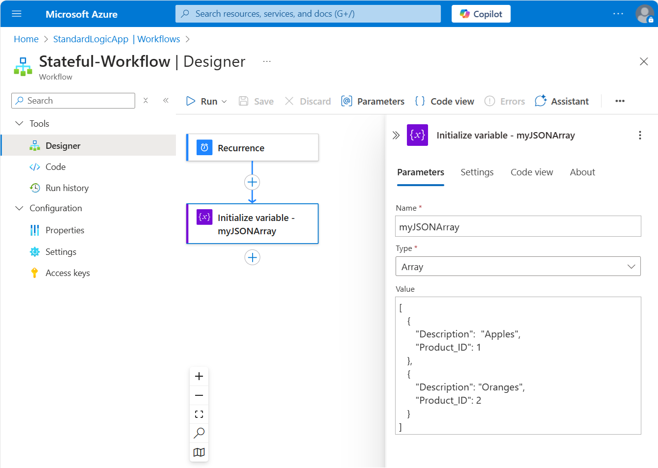 This example uses the Azure portal and a sample workflow with the Recurrence trigger followed by an Initialize variable action. The action is set up to create a variable where the initial value is an array that has some properties and values in JSON format.