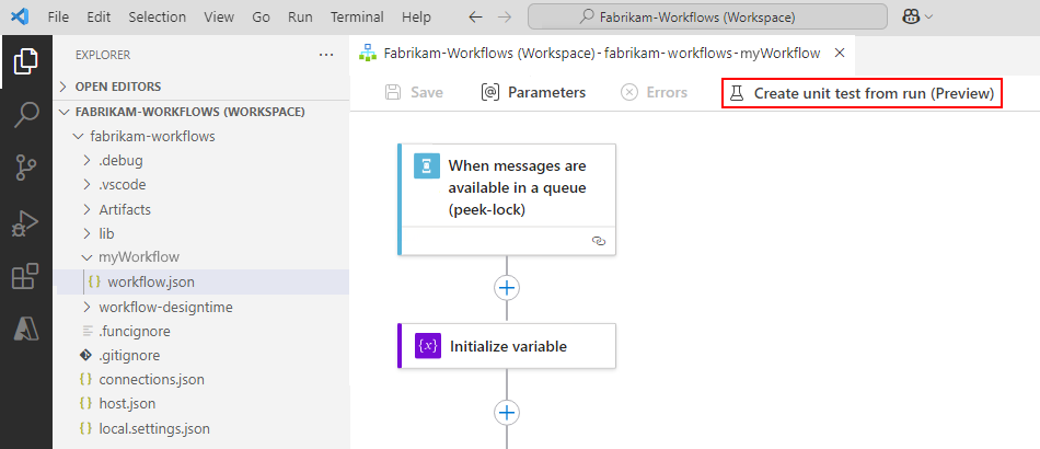This guide shows how to create a unit test definition from a workflow. This definition mocks the external calls from each workflow operation without changing the workflow logic. When you create a unit test for a workflow, you get a unit test project that includes the following folders: