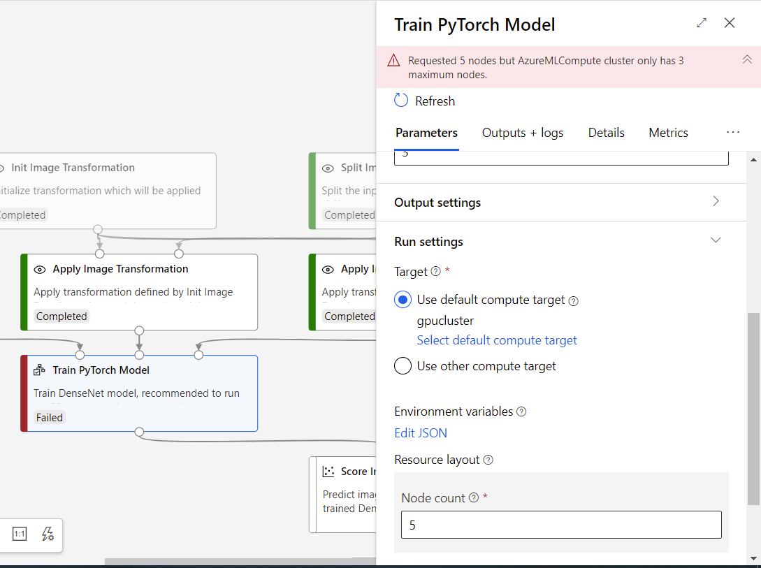 The following example shows that the Node count of run settings is larger than available node count of compute cluster.