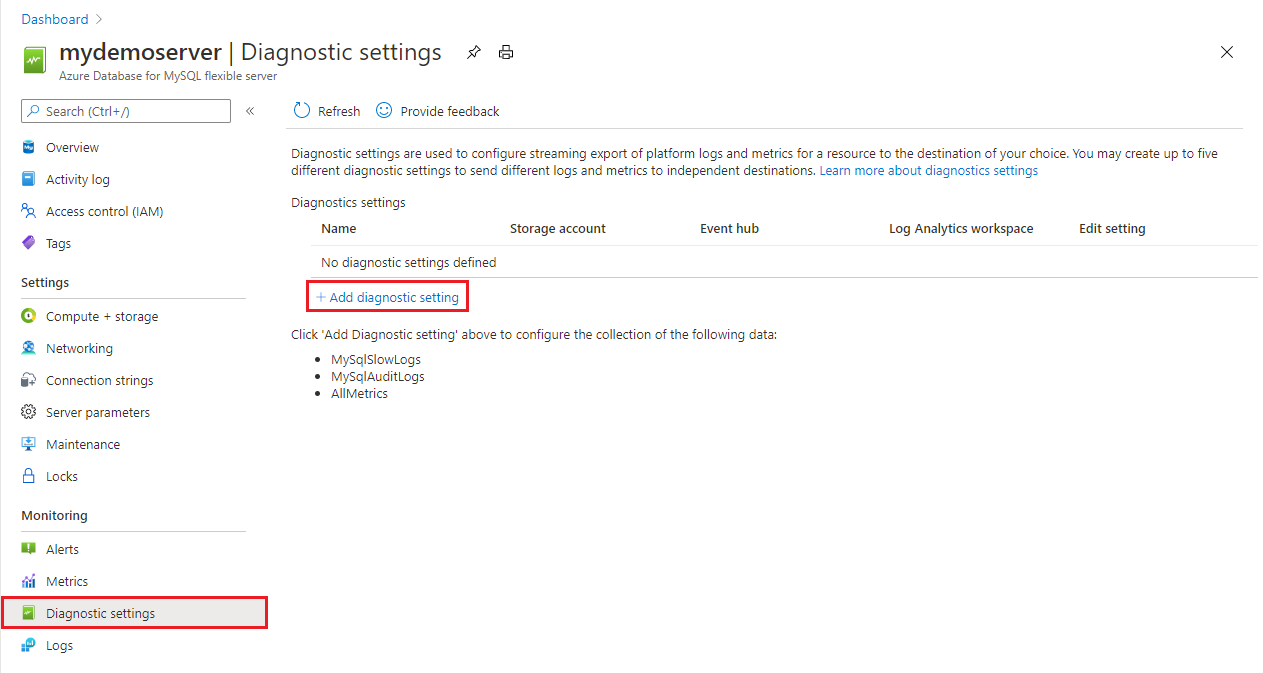 On the Diagnostics settings pane, select Add diagnostic setting.