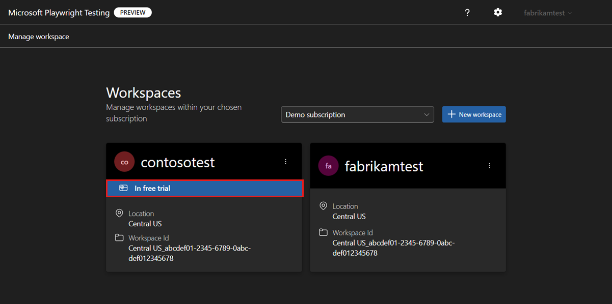 The name can only consist of alphanumerical characters, and have a length between 3 and 64 characters.Azure subscription Select the Azure subscription that you want to use for this Microsoft Playwright Testing workspace. Region Select a geographic location to host your workspace.