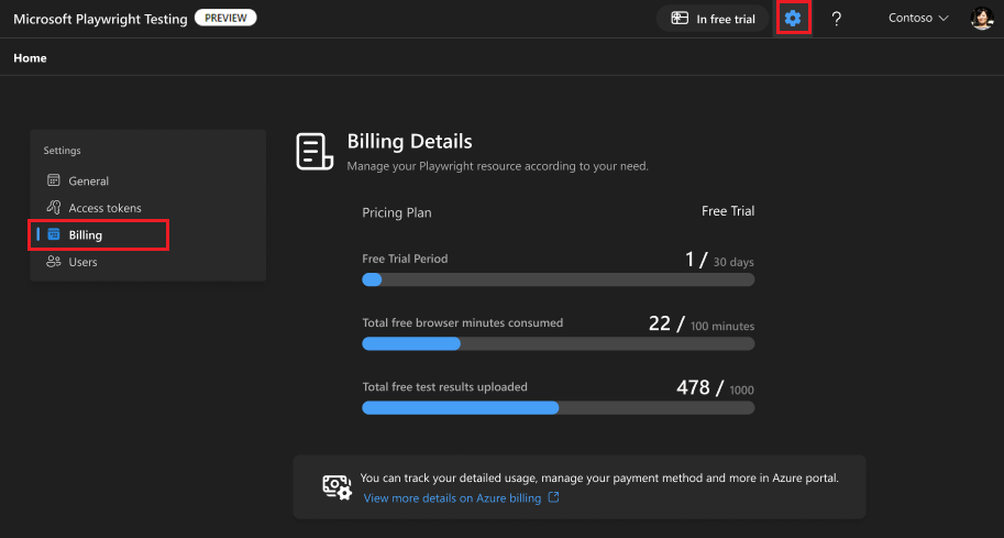 Microsoft Playwright Testing Preview is a fully managed service for end-to-end testing built on top of Playwright. With the free trial, you can try Microsoft Playwright Testing for free for 30 days, 100 test minutes, and 1,000 test results. In this article, you learn about the limits of the free trial, how to get started, and how to track your free trial usage.