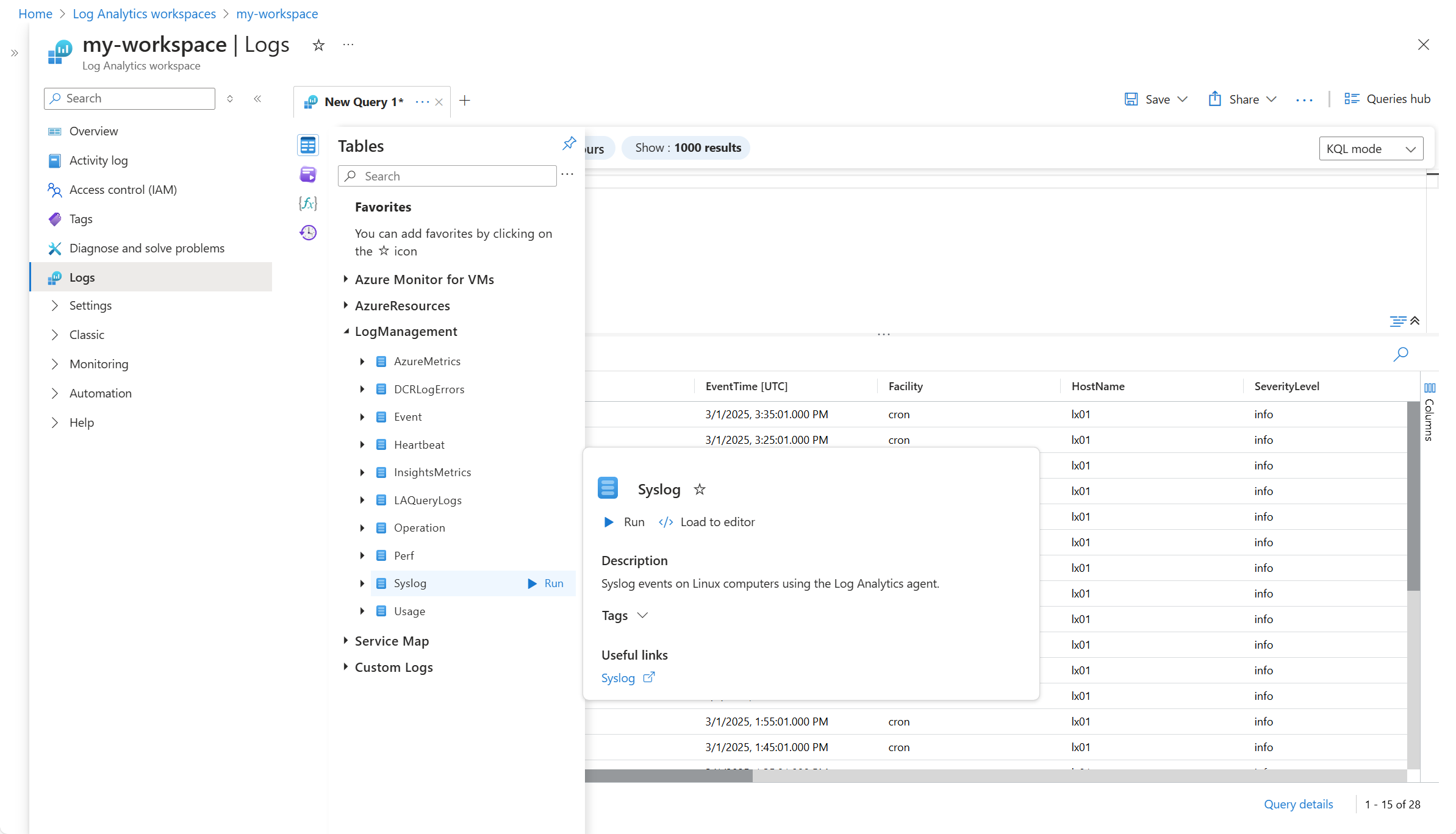 To verify that data is being collected, check for records in the Syslog table. From the virtual machine or from the Log Analytics workspace in the Azure portal, select Logs and then click the Tables button. Under the Virtual machines category, click Run next to Syslog.