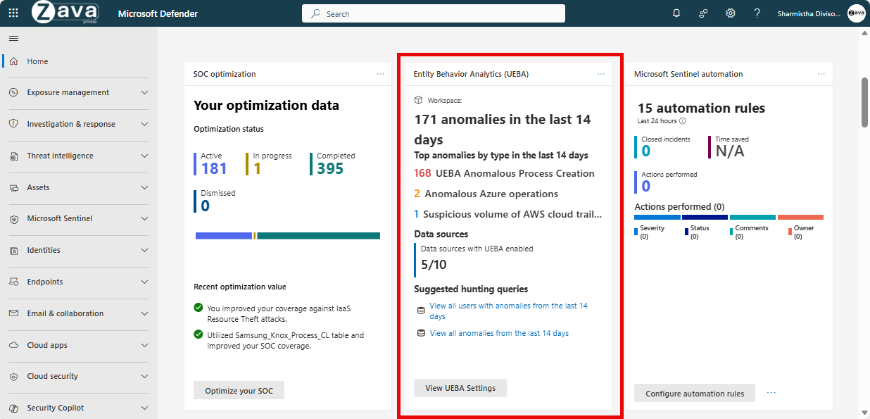 By surfacing anomalies in investigation graphs and user pages, and prompting analysts to incorporate anomaly data in hunting queries, UEBA facilitates faster threat detection, smarter prioritization, and more efficient incident response.