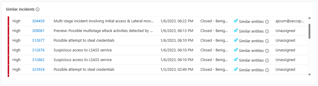 | Similar entities | An incident is considered similar to another incident if they both include the same entities. The more entities two incidents have in common, the more similar they're considered to be. |