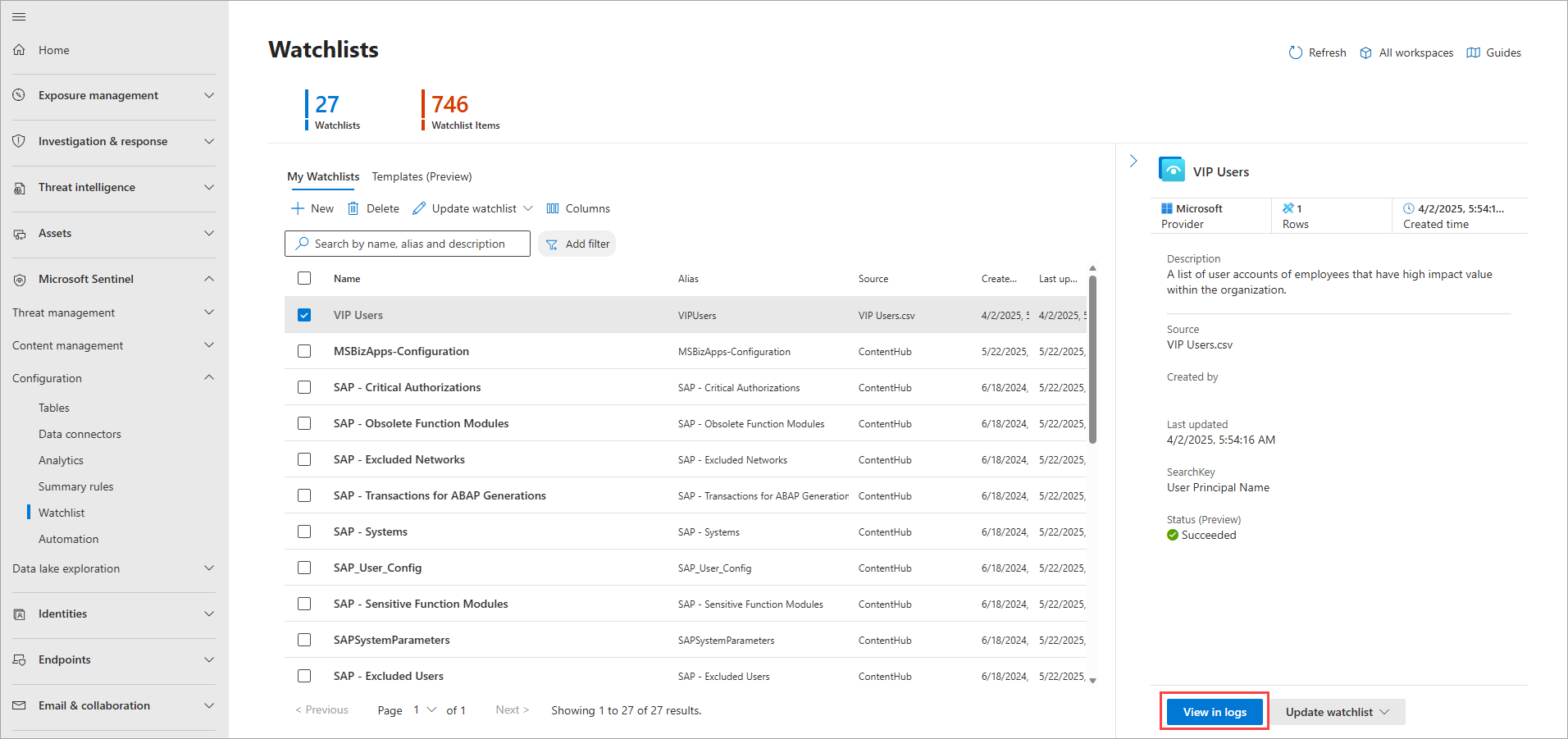 When the status is Succeeded, select View in logs to use the watchlist in a query. It might take several minutes for the watchlist to show in Log Analytics.
