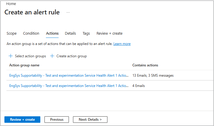Use the Actions tab to select from existing groups, or create new action groups to set up the actions you want to happen with the alert triggers. For more information, see Action groups.