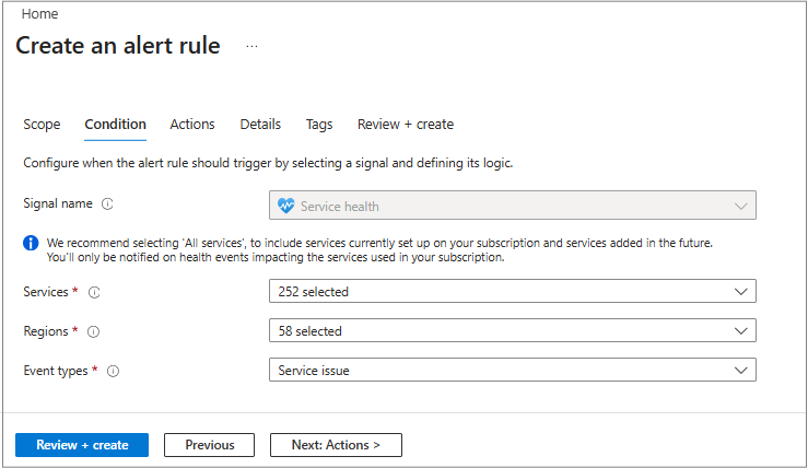 We recommend selecting all Services and all Regions when configuring Service Health alerts. Service Health only triggers alerts when events affect the regions where your services are running. As a result, selecting everything doesn't result in alerts for unused services or regions.