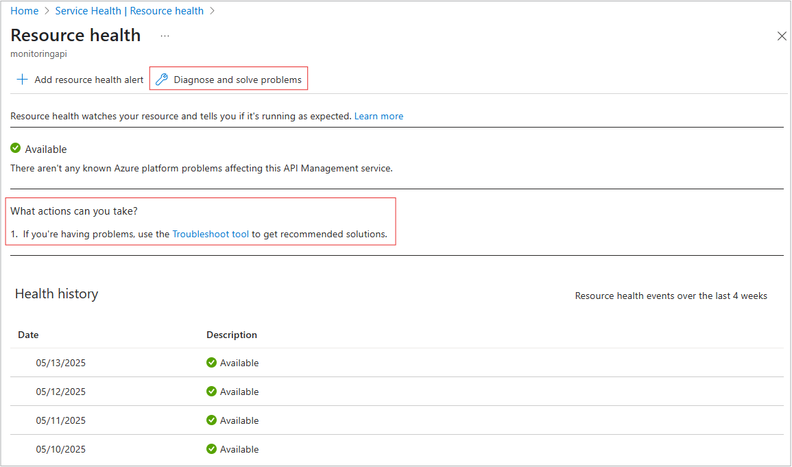 If a resource is unhealthy, Resource Health analyzes additional information to determine the source of the problem. It also reports on actions that Microsoft is taking to fix the problem and identifies actions that you can do to address it.
