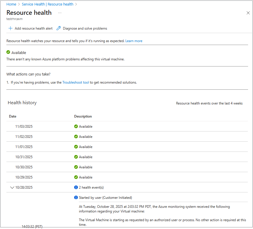 If Azure finds the cause of a platform-initiated outage, the details about it can appear in Resource Health within 72 hours. This action applies only to virtual machines.