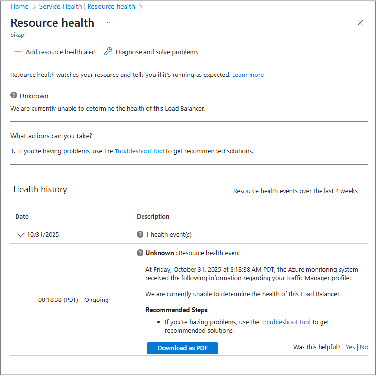- From the health history grid, select the link to the resource health name to open a new window with information about this resource.