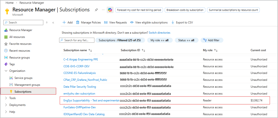 Log into the Azure portal and navigate to the Subscriptions section.