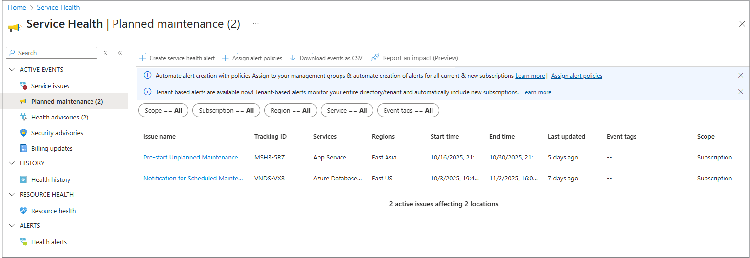 On the main panel you can sort the displayed list of Planned maintenance events by Scope, Subscription, Region, Service, and Event tags.