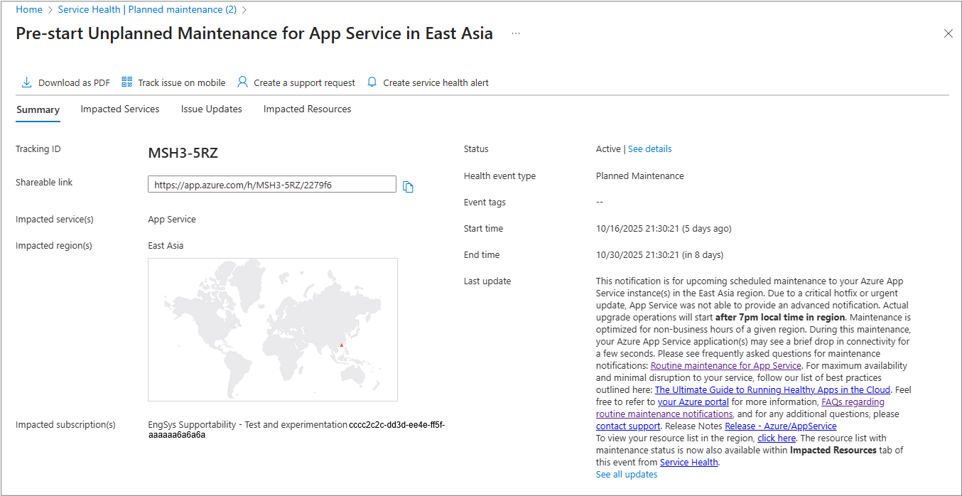 For more information about Impacted resources, see Impacted Resources from Planned maintenance events.
